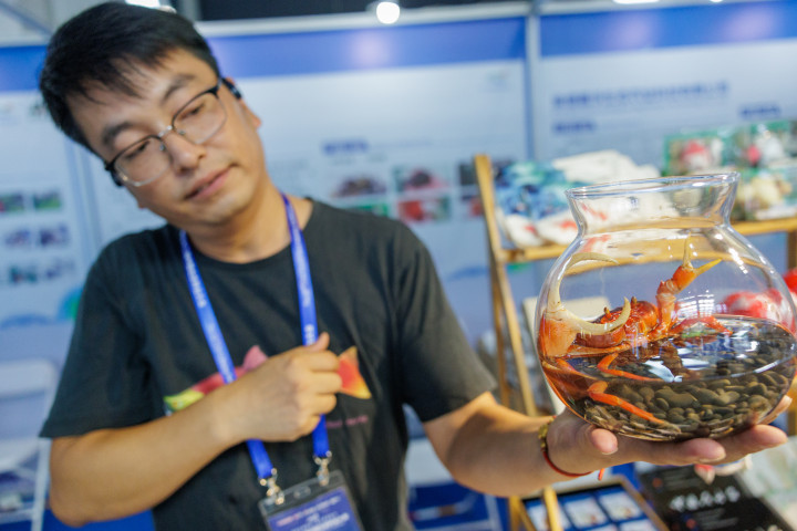 位于通州区漷县镇的北京九鱼种业有限公司带来了多种宠物蟹,它们外壳颜色鲜亮,有红色、黄色、紫色等,在透明的玻璃罐中格外漂亮。据展位工作人员介绍,现在年轻人喜欢和宠物互动,又不想投入太多精力,宠物蟹饲养简单,不挑食,1-2周喂一次即可,零售价格每只在100元-400元之间,它们还有“巨有钱(钳)”“四平八稳”等好寓意,在宠物市场很受欢迎。“我们将地蟹、溪蟹等品种引到国内来繁育,已经十多年了,现在销路很好。”