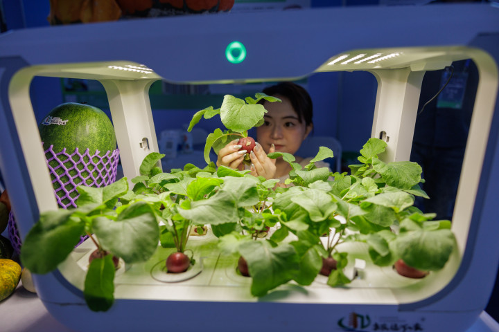 工作人员正在展示智能水培箱。新京报记者王子诚摄